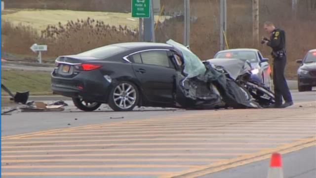 A woman was badly injured when the car she was driving turned in front of a tractor-trailer where Route 15 crosses over Interstate 390 in Livingston County.